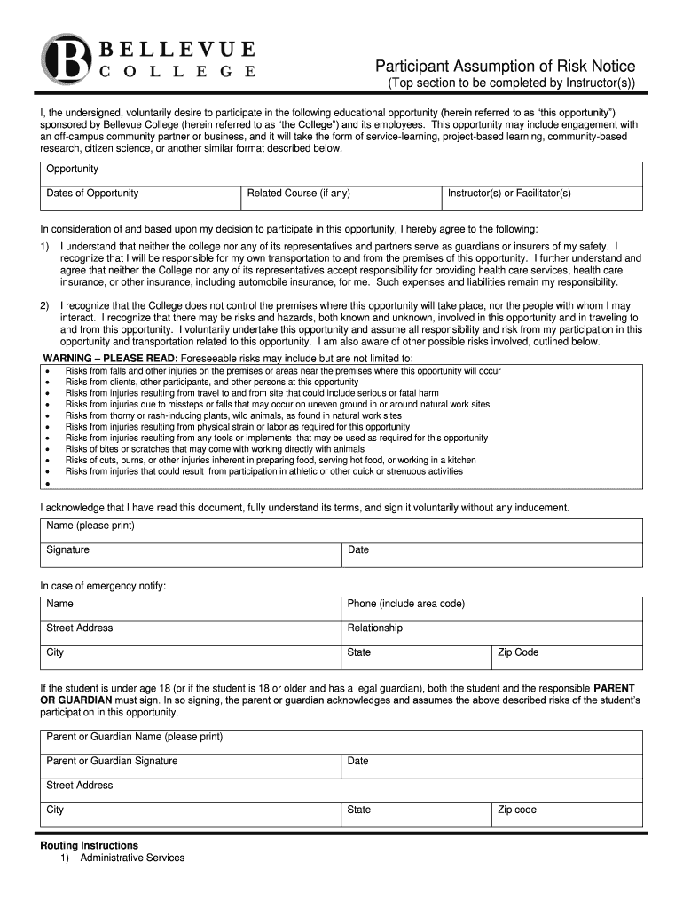 Get the free Participant Assumption of Risk Notice - Bellevue College