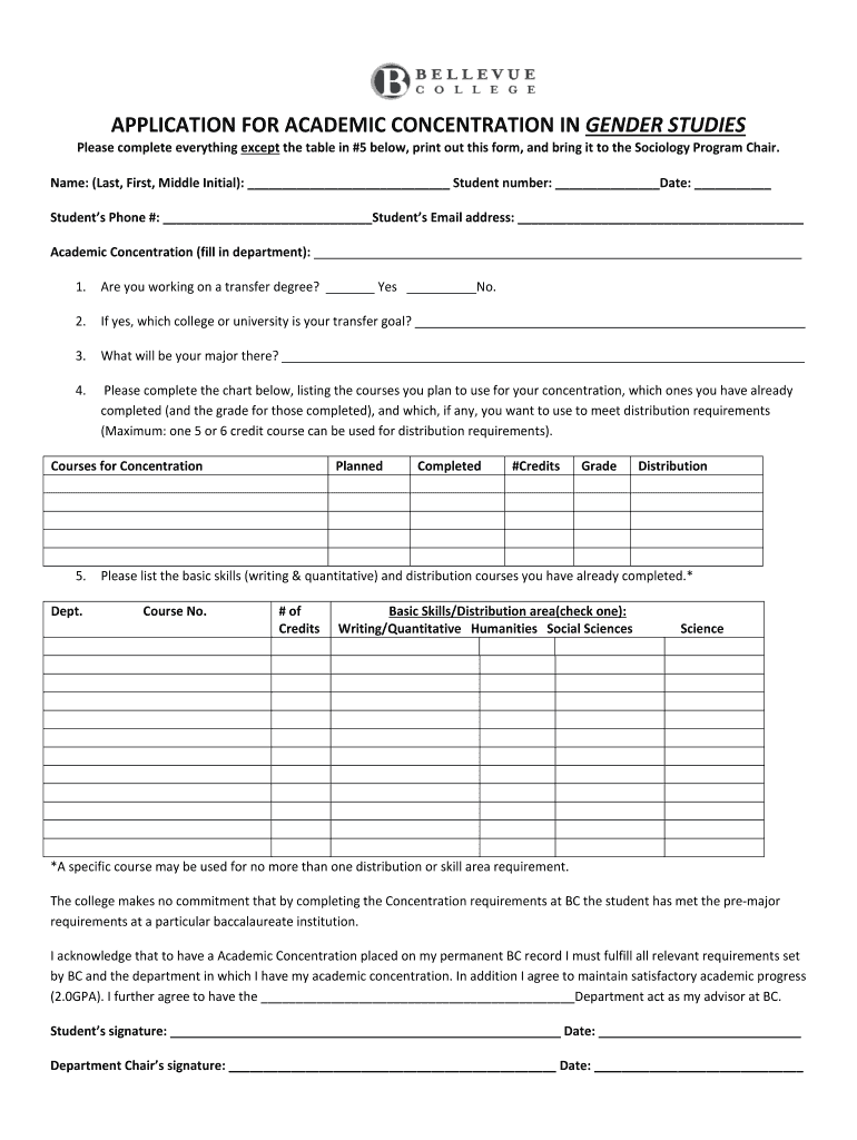 APPLICATION FOR ACADEMIC CONCENTRATION IN GENDER STUDIESPlease complete everything except the table in #5 below, print out this form, and bring it to the Sociology Program Chair. Name: (Last, First,