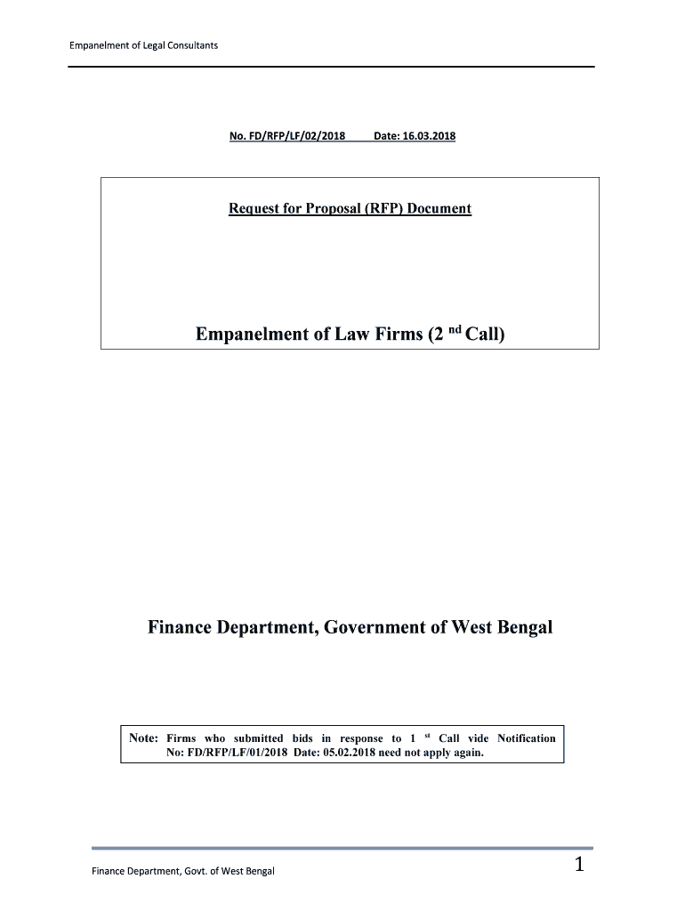 EmpanelmentofLegalConsultants No.FD/RFP/LF/02/2018Date:16.03.2018Request for Proposal (RFP) DocumentEmpanelment of Law Firms (2nd Call) Finance Department, Government of West Bangalore: Firms who