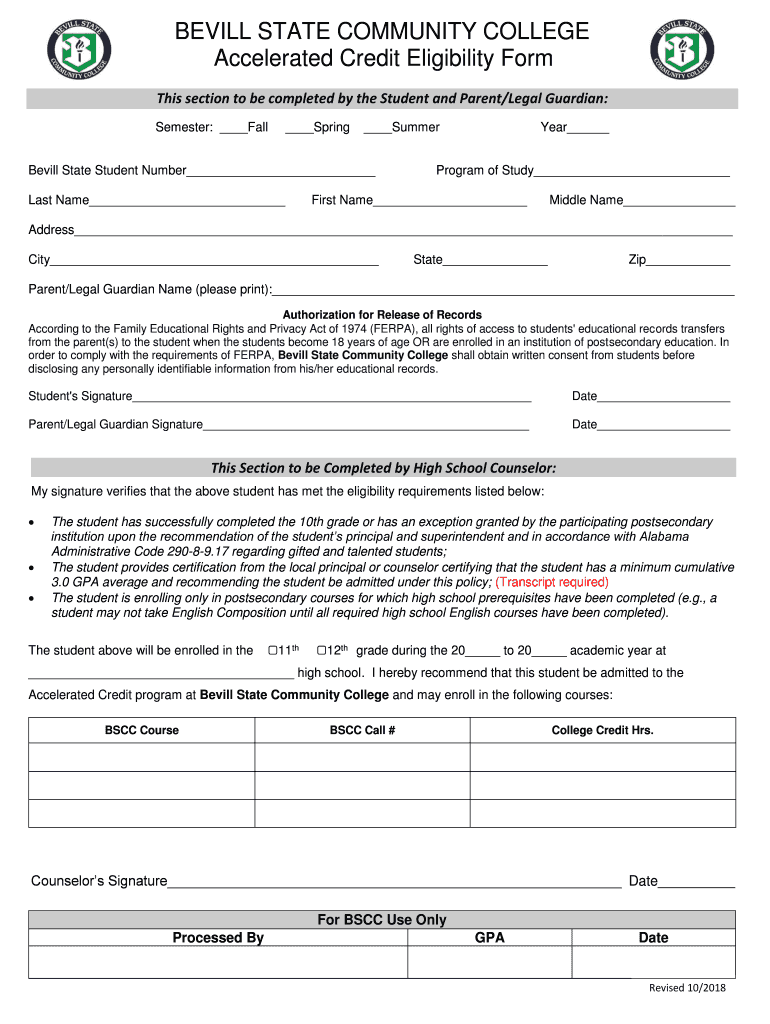 BILL STATE COMMUNITY COLLEGE Accelerated Credit Eligibility Form This section to be completed by the Student and Parent/Legal Guardian: Semester: Fall Spring Summerville State Student Number Last