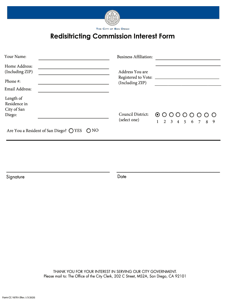 Redistricting Commission Interest Form Your Name: Home Address: (Including ZIP) Email Address: Length of Residence in City of San Diego: Phone #:Are You a Resident of San Diego? SignatureYESBusiness