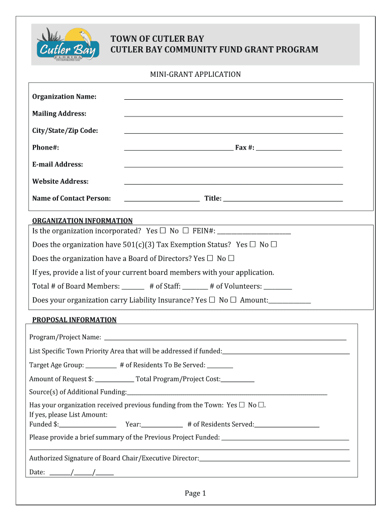 TOWN OF CUTLER BAY COMMUNITY FUND GRANT PROGRAM MIGRANT APPLICATION Organization Name: Mailing Address: City/State/Zip Code: Phone#: Fax #: Email Address: Website Address: Name of Contact Person: