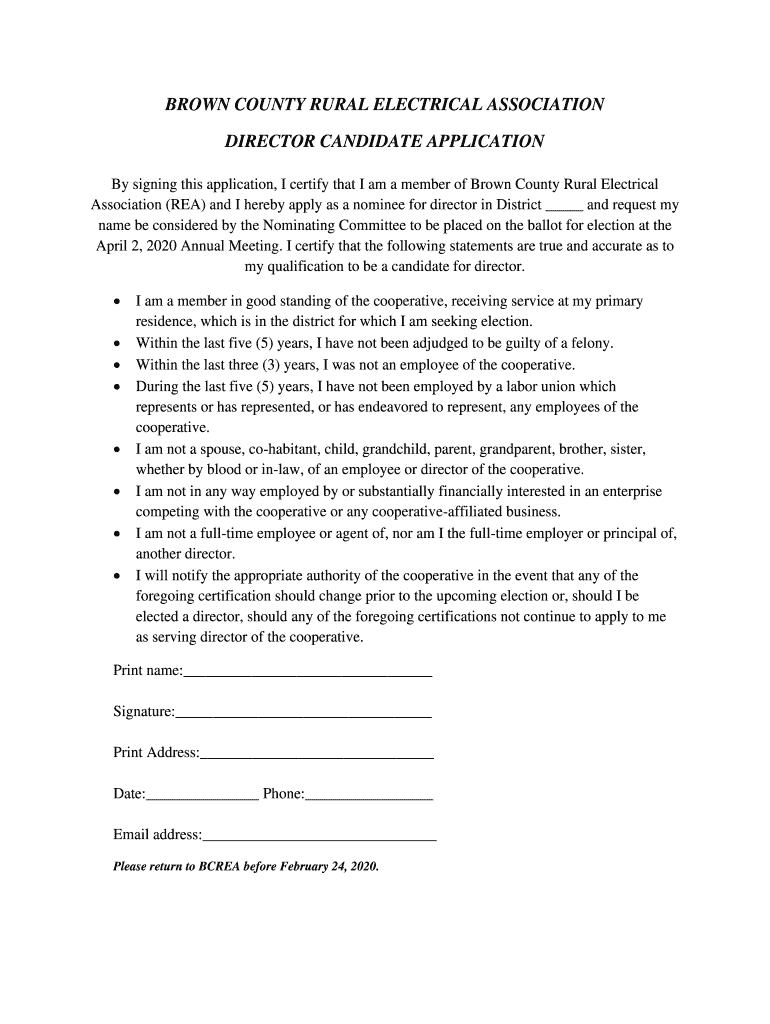 BROWN COUNTY RURAL ELECTRICAL ASSOCIATION DIRECTOR CANDIDATE APPLICATION By signing this application, I certify that I am a member of Brown County Rural Electrical Association (REA) and I hereby apply