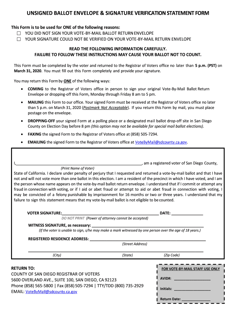 UNSIGNED BALLOT ENVELOPE & SIGNATURE VERIFICATION STATEMENT From This Form is to be used for ONE of the following reasons: YOU DID NOT SIGN YOUR VOTEBYMAIL BALLOT RETURN ENVELOPE YOUR SIGNATURE COULD