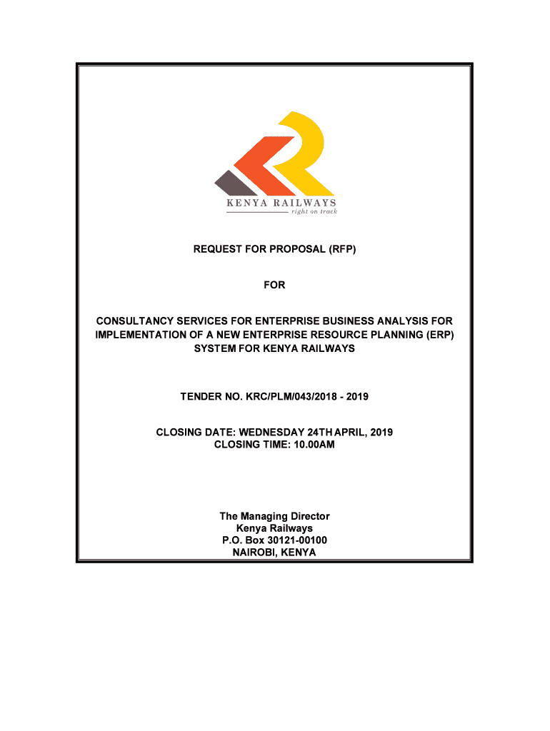 REQUEST FOR PROPOSAL (RFP) FOR CONSULTANCY SERVICES FOR ENTERPRISE BUSINESS ANALYSIS FOR IMPLEMENTATION OF A NEW ENTERPRISE RESOURCE PLANNING (ERP) SYSTEM FOR KENYA RAILWAYSTENDER NO. ARC/PLM/043/2018