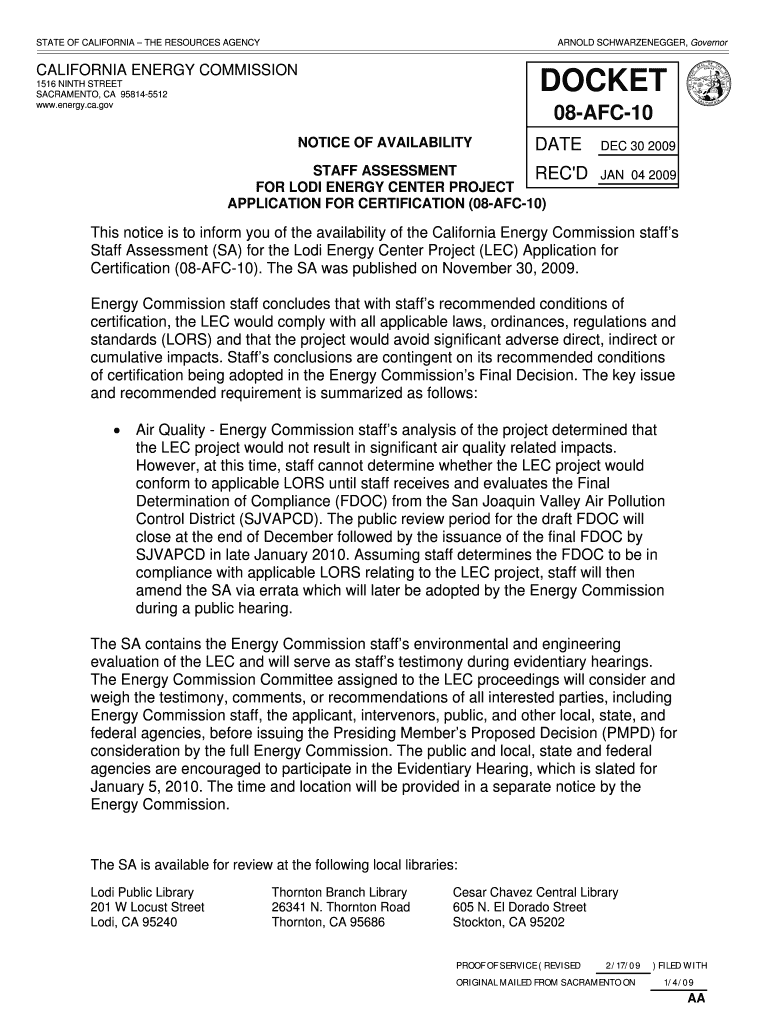STATE OF CALIFORNIA THE RESOURCES AGENCYARNOLD SCHWARZENEGGER, GovernorCALIFORNIA ENERGY COMMISSIONDOCKET1516 NINTH STREET SACRAMENTO, CA 958145512 www.energy.ca.gov08AFC10 NOTICE OF AVAILABILITYDATEDEC