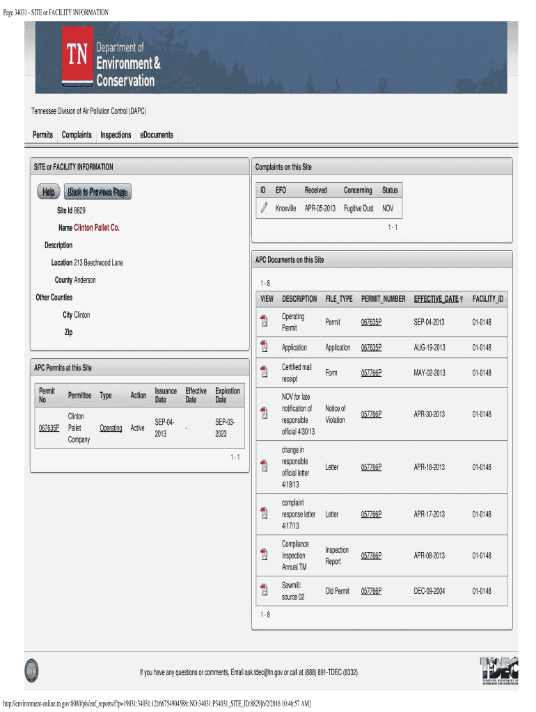 Page 34031 SITE or FACILITY INFORMATION Tennessee Division of Air Pollution Control (APC)PermitsComplaintsInspectionseDocumentsSITE or FACILITY INFORMATIONHelpComplaints on this Site Back to Previous