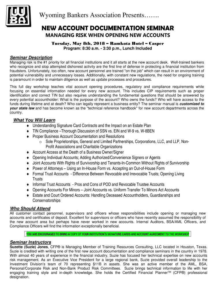 Wyoming Bankers Association Presents. NEW ACCOUNT DOCUMENTATION SEMINAR MANAGING RISK WHEN OPENING NEW ACCOUNTS Tuesday, May 8th, 2018 Dakota Hotel Casper Program: 8:30 a.m. 3:30 p.m., Lunch IncludedSeminar