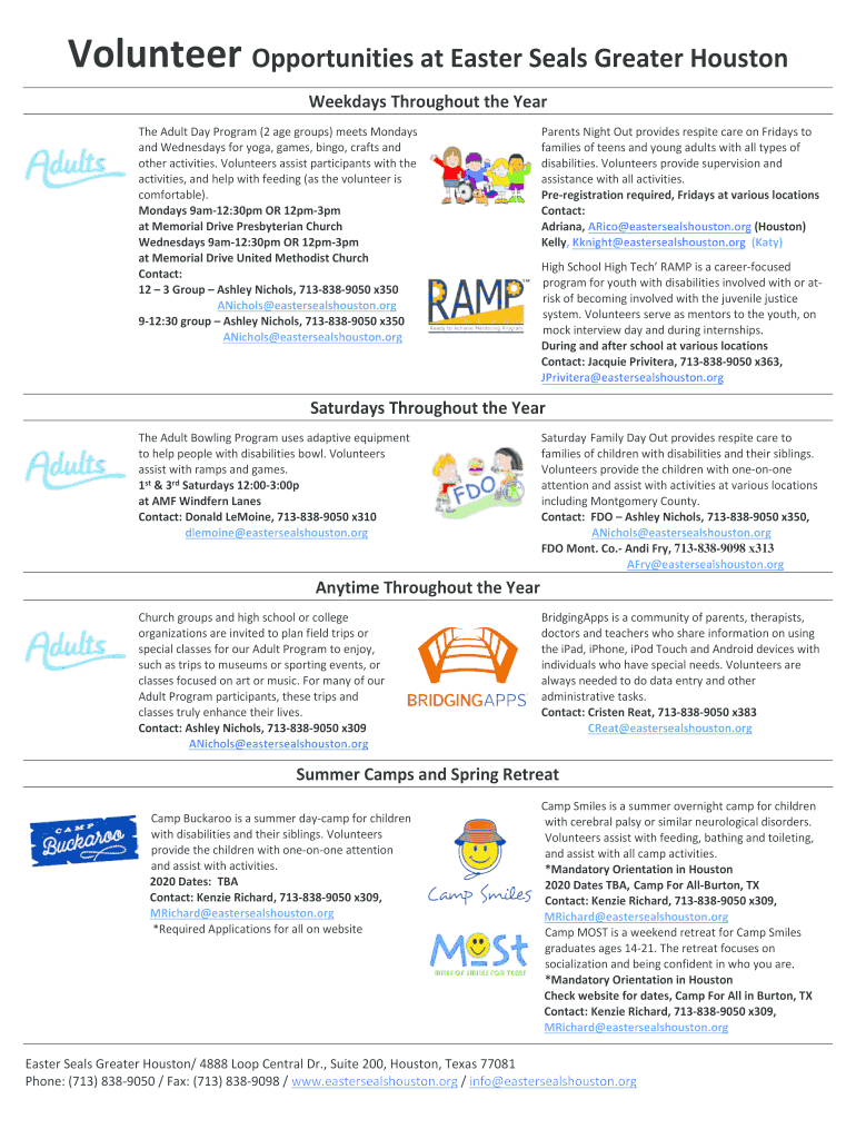 Volunteer Opportunities at Easter Seals Greater Houston Weekdays Throughout the Year The Adult Day Program (2 age groups) meets Mondays and Wednesdays for yoga, games, bingo, crafts and other activities.