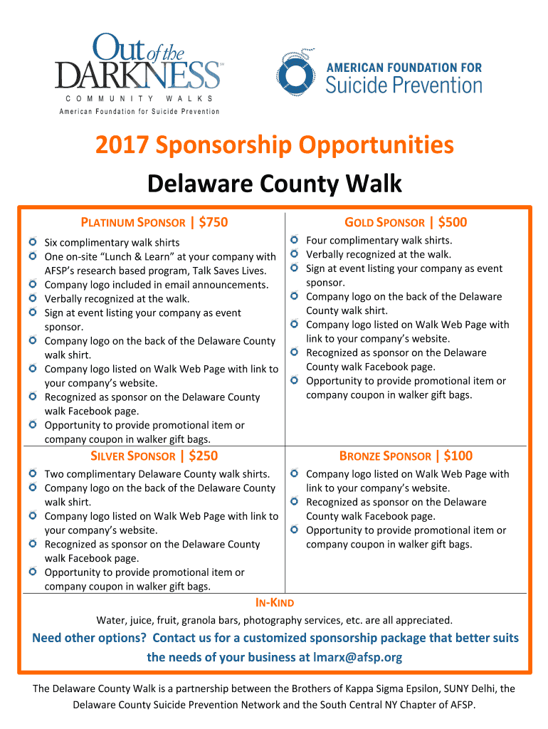 2017 Sponsorship Opportunities Delaware County Walk PLATINUM SPONSOR $750 Six complimentary walk shirts One onsite Lunch & Learn at your company with Asps research based program, Talk Saves Lives.