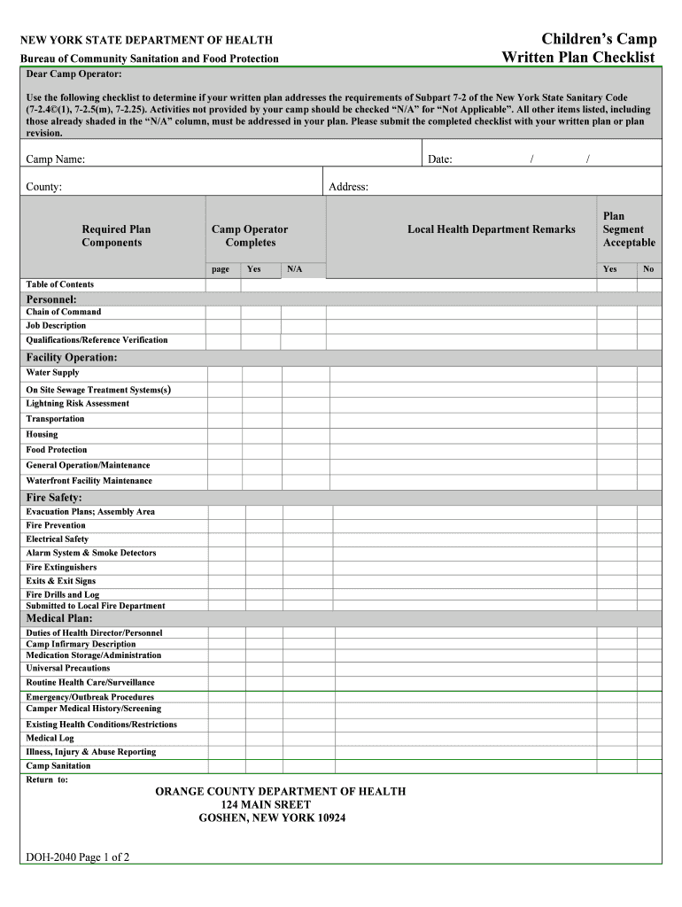 Written Plan Checklist YORK STATE DEPARTMENT OF HEALTH
