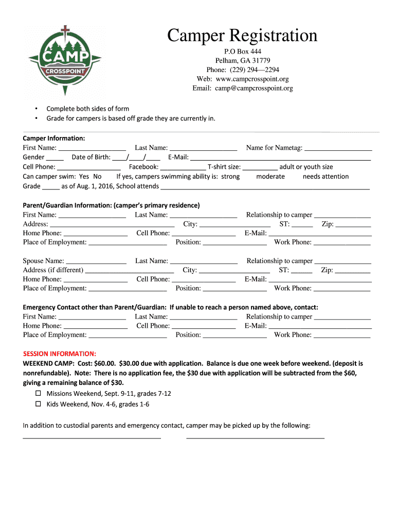 Camper Registration P. O Box 444 Pelham, GA 31779 Phone: (229) 2942294 Web: www.campcrosspoint.org Email: camp campcrosspoint.org Complete both sides of form Grade for campers is based off grade they