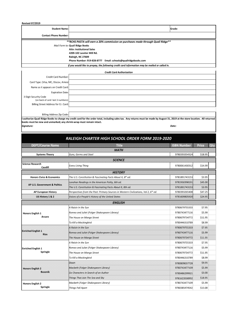 Student Name:Grade:Contact Phone Number:**RCS PASTA will earn a 20% commission on purchases made through Quail Ridge**
