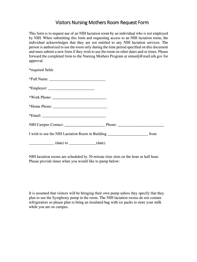Visitors Nursing Mothers Room Request Forms form is to request use of an NIH lactation room by an individual who is not employed