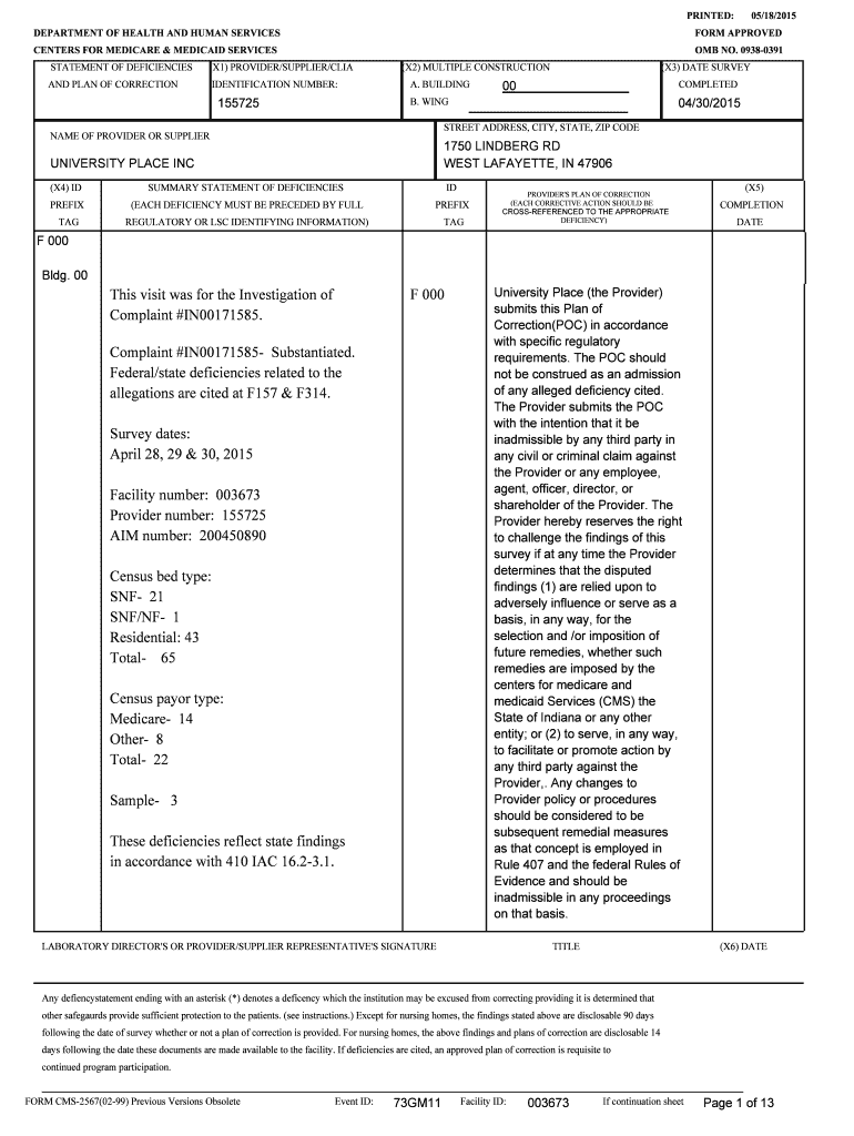 PRINTED: DEPARTMENT OF HEALTH AND HUMAN SERVICES CENTERS FOR MEDICARE & MEDICAID SERVICES STATEMENT OF DEFICIENCIES(X1) PROVIDER/SUPPLIER/LIGAND PLAN OF CORRECTIONIDENTIFICATION NUMBER:15572505/18/2015FORM