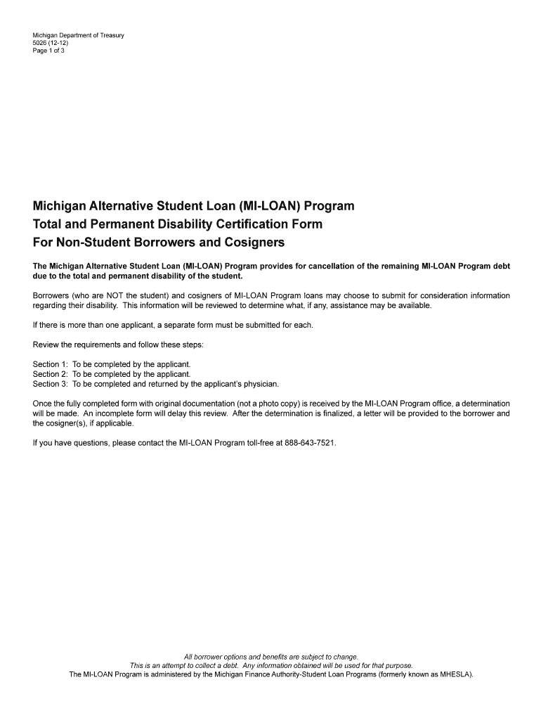 Get the free 5026, Michigan Alternative Student Loan Program Total and Permanent Disability Certi...