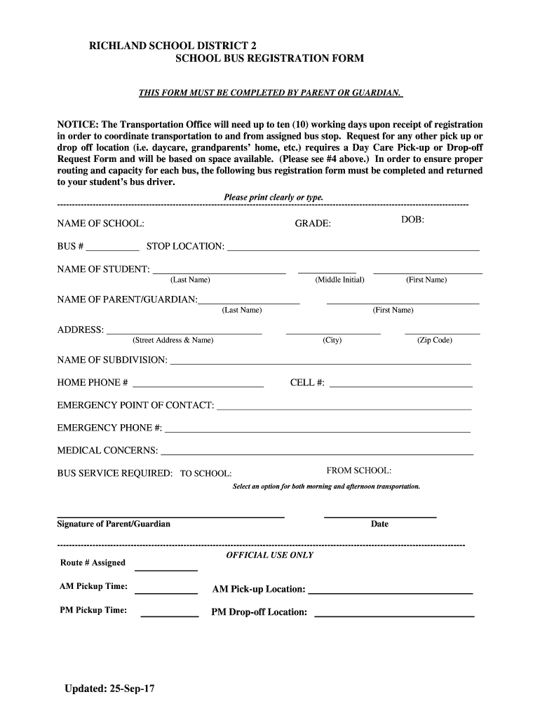 TO:ALL PARENTS/GUARDIANSFROM: District Transportation Officer:Bus Registration Form1. Please complete the school bus registration form if you plan on having your student ride the