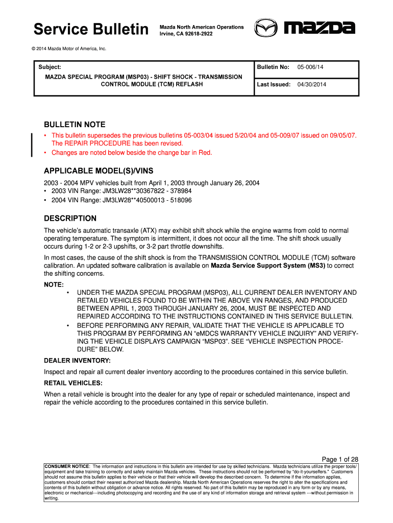 Service Bulletin Mazda North American Operations Irvine, CA 926182922 2014 Mazda Motor of America, Inc. Subject: MAZDA SPECIAL PROGRAM (MSP03) SHIFT SHOCK TRANSMISSION CONTROL MODULE (TCM) REFLASHBulletin