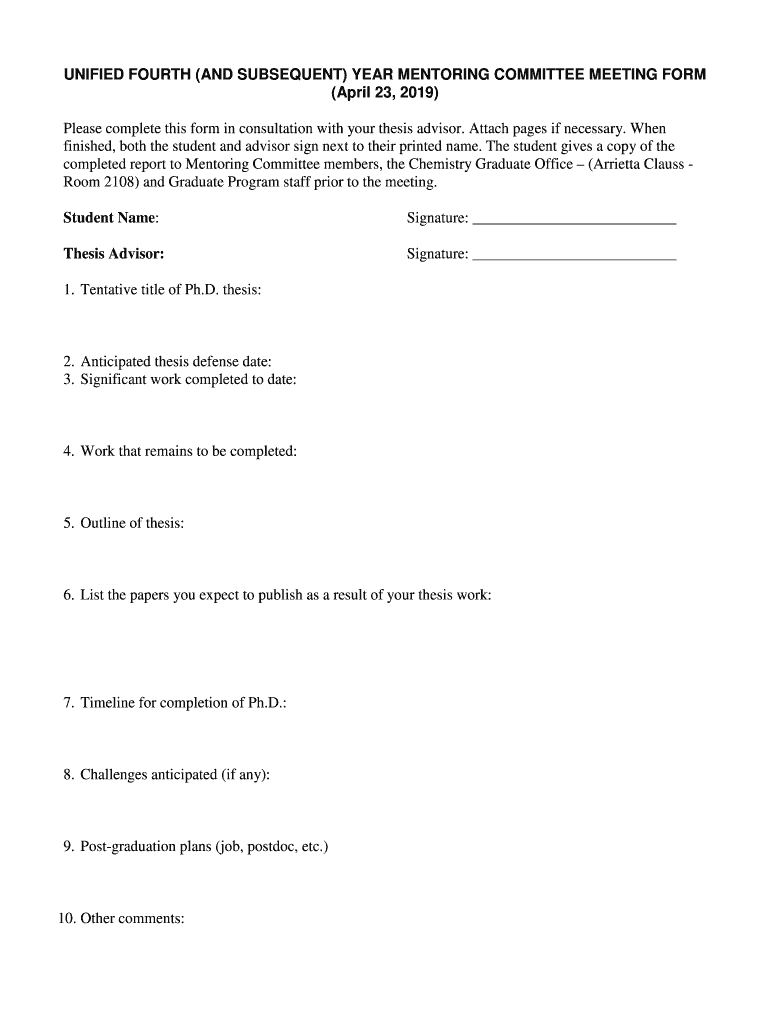 UNIFIED FOURTH (AND SUBSEQUENT) YEAR MENTORING COMMITTEE MEETING FORM (April 23, 2019) Please complete this form in consultation with your thesis advisor. Attach pages if necessary. When finished,