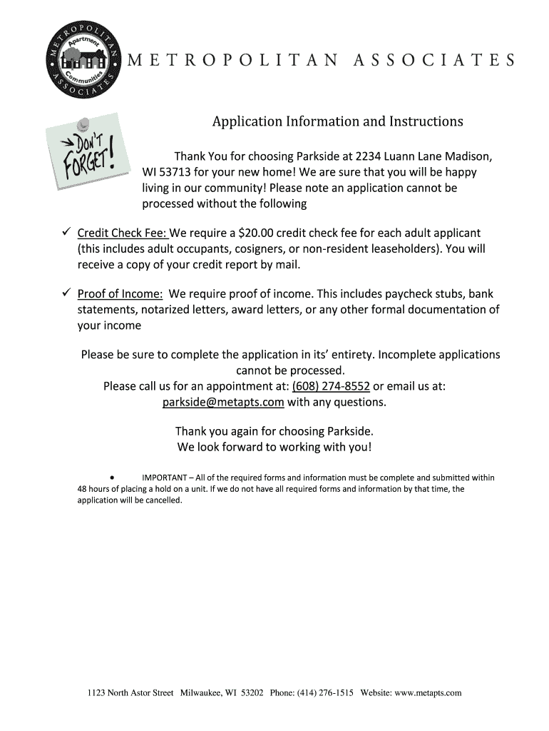 Application Information and Instructions Thank You for choosing Park side at 2234 Luann Lane Madison, WI 53713 for your new home! We are sure that you will be happy living in our community! Please