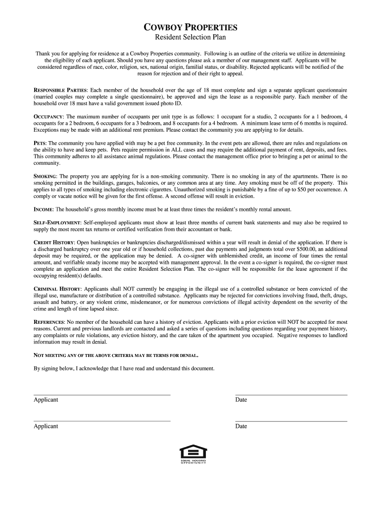 Thank you for applying for residence at a Cowboy Properties community. Following is an outline of the criteria we utilize in determining