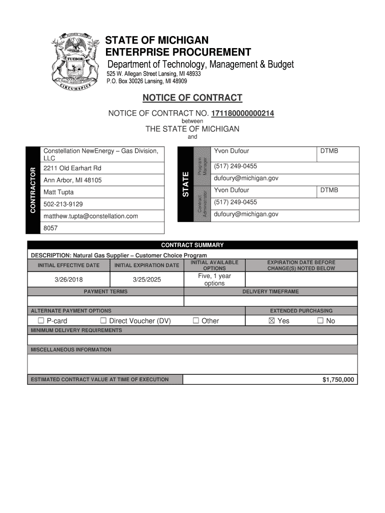 STATE OF MICHIGAN ENTERPRISE PROCUREMENT Department of Technology, Management & Budget 525 W. Alleged Street Lansing, MI 48933 P.O. Box 30026 Lansing, MI 48909NOTICE OF CONTRACT NOTICE OF CONTRACT