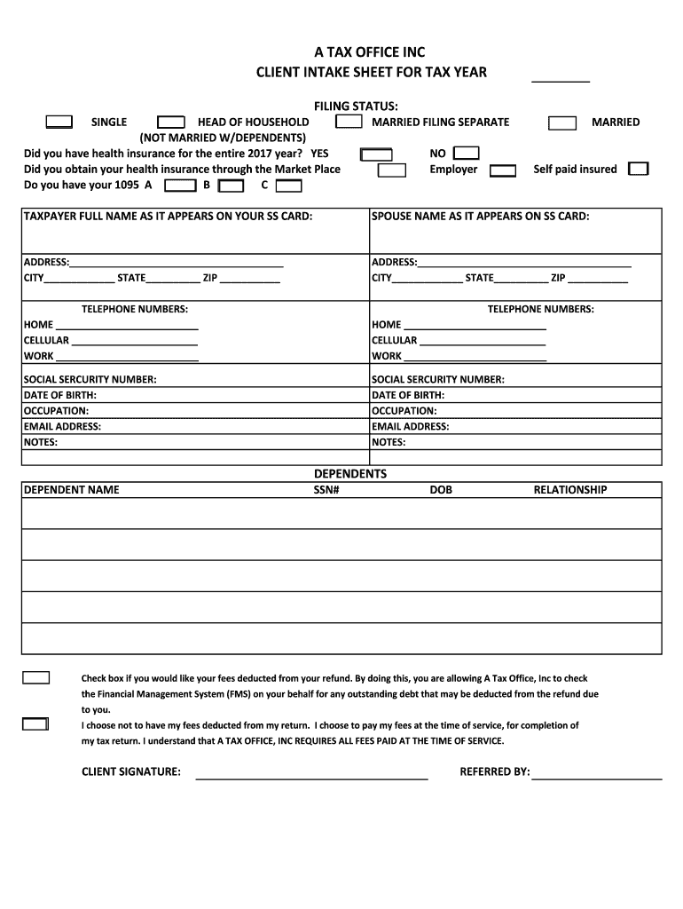 A TAX OFFICE INC CLIENT INTAKE SHEET FOR TAX YEAR FILING STATUS: SINGLED OF HOUSEHOLD (NOT MARRIED W/DEPENDENTS) Did you have health insurance for the entire 2017 year?YES Did you obtain your health