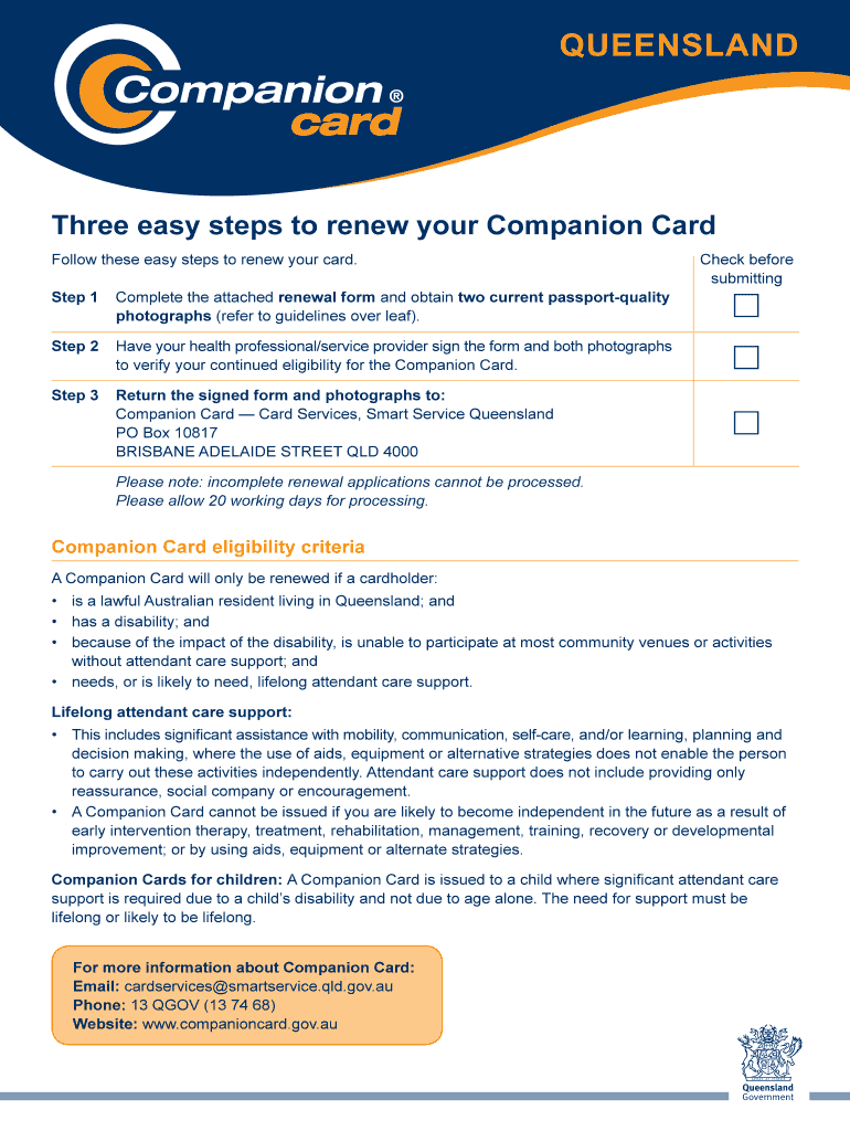 QUEENSLANDThree easy steps to renew your Companion Card Follow these easy steps to renew your card. Check before submitting Step 1Complete the attached renewal form and obtain two current passport