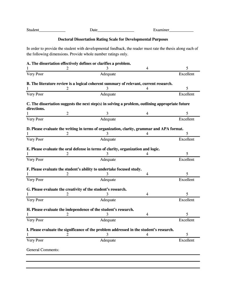 Student Date Examiner Doctoral Dissertation Rating Scale for Developmental Purposes In order to provide the student with developmental feedback, the reader must rate the thesis along each of the following