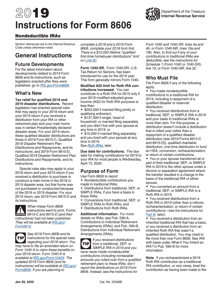 Start by downloading the IRS Form 8606 instructions for the tax year 2019.