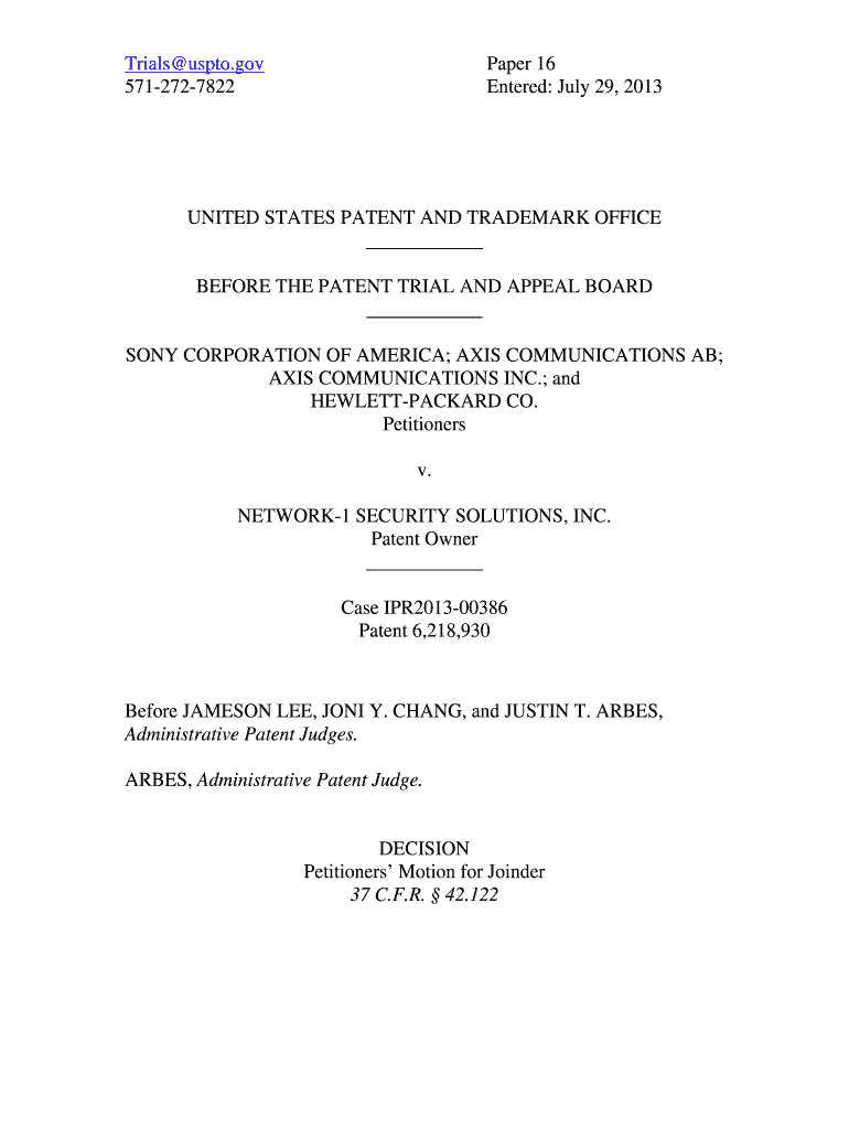 Trials USPTO.gov 5712727822Paper 16 Entered: July 29, 2013UNITED STATES PATENT AND TRADEMARK OFFICE BEFORE THE PATENT TRIAL AND APPEAL BOARD SONY CORPORATION OF AMERICA; AXIS COMMUNICATIONS AB; AXIS