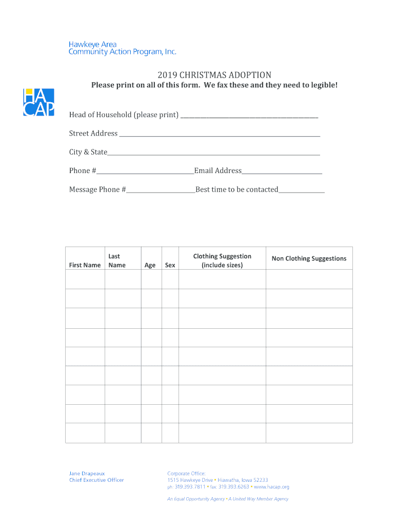 2019 CHRISTMAS ADOPTIONPlease print on all of this form. We fax these and they need to legible! Head of Household (please print) Street Address City & State Phone # Email Address Message Phone # Best