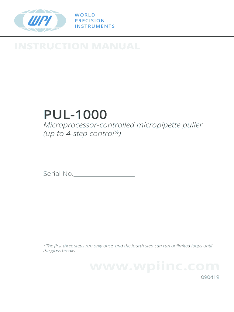 WORLD PRECISION INSTRUMENTSINSTRUCTION MANUALPUL1000Microprocessorcontrolled micropipette puller (up to 4step control*)Serial No. *The first three steps run only once, and the fourth step can run