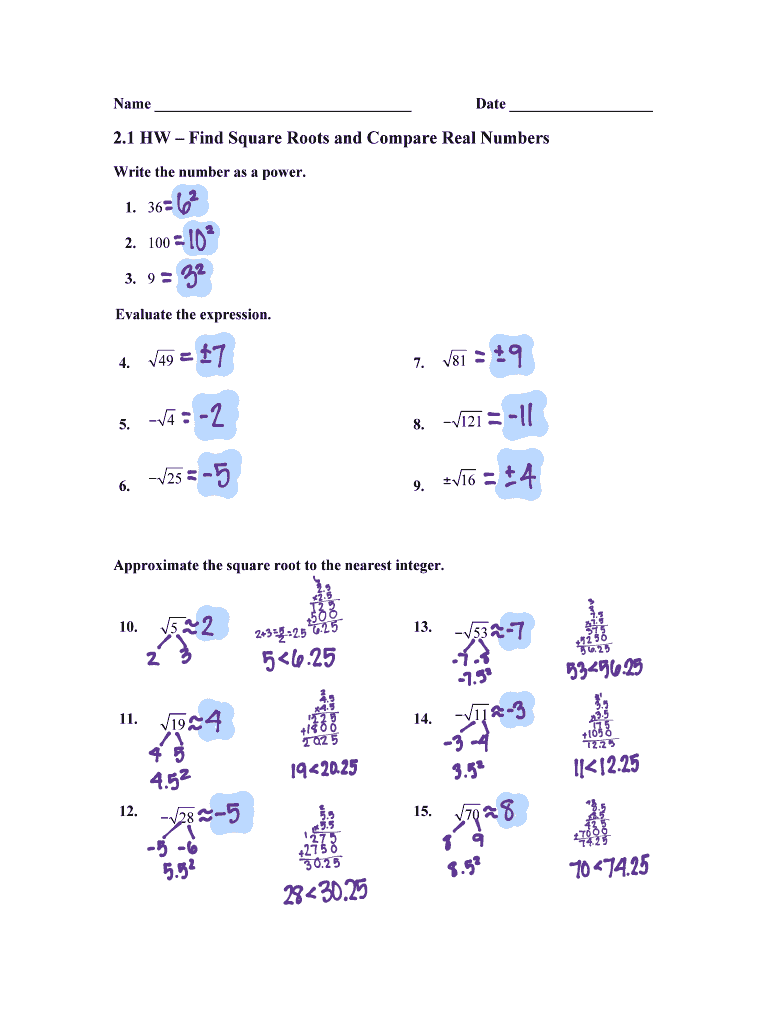 Name Date 2.1 HW Find Square Roots and Compare Real Numbers Write the number as a power. 1. 36 2. 100 3. 9 Evaluate the expression. 4.497.815. 48. 1216. 259. 16Approximate the square root to the nearest