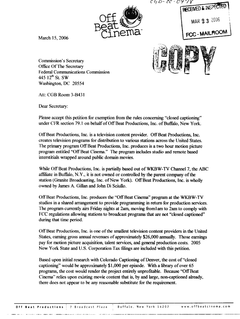 Of BEC;r n 'Ia “C 7 Dec r;;, 'f: '!. '/Y;;:;:;;::;ffil1 March. Né ll March 15,2006RECEIVED a. NS?t2 3 2006FCC MAIL 'Commission's Secretary Office Of The Secretary Federal Communications Commission