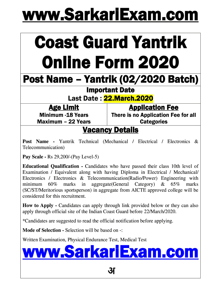 WWW.SarkariExam.com Coast Guard Yantra Online Form 2020 Post Name Yantra (02/2020 Batch) Important Date Last Date : 22. March.2020 Age Limit Application Fee Minimum 18 Years Maximum 22 Earthier is