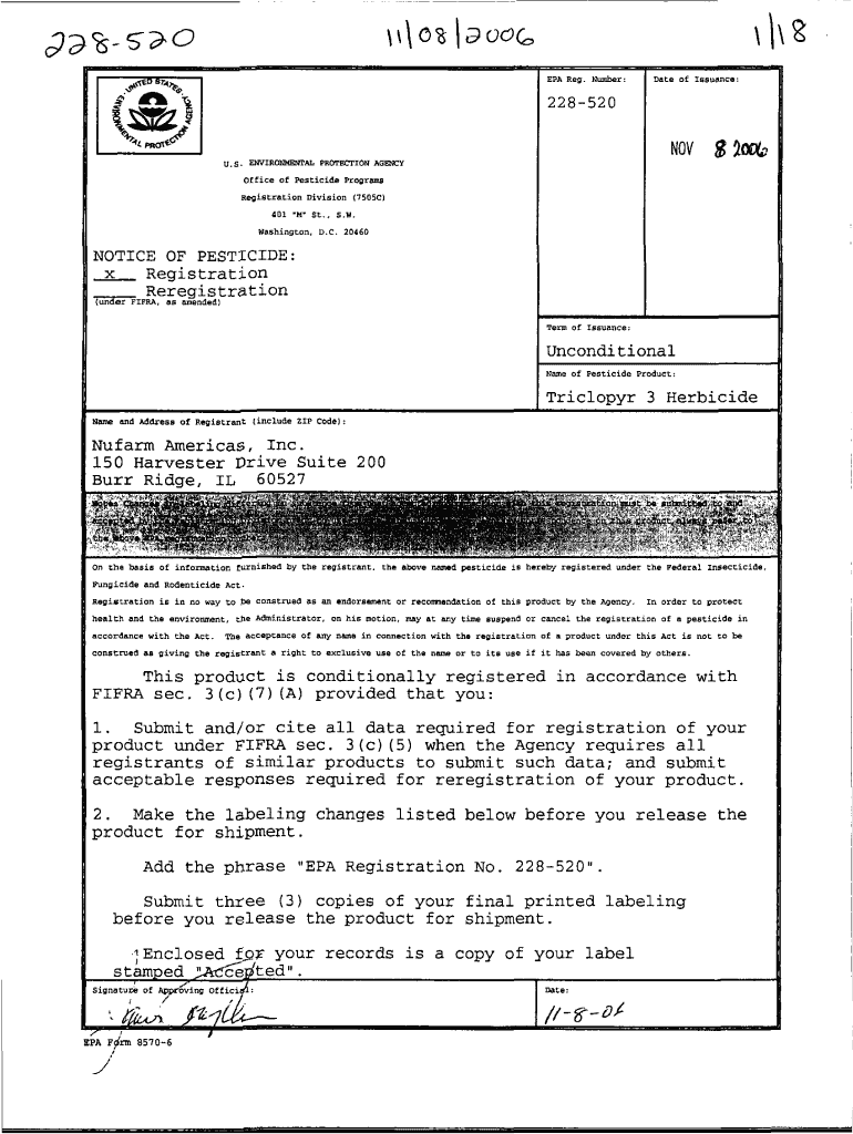 EPA Reg. Number:Date fissure:228520NOVu.s. ENVIRONMENTAL PROTECTION AGENCY2ocv., Office of Pesticide Programs