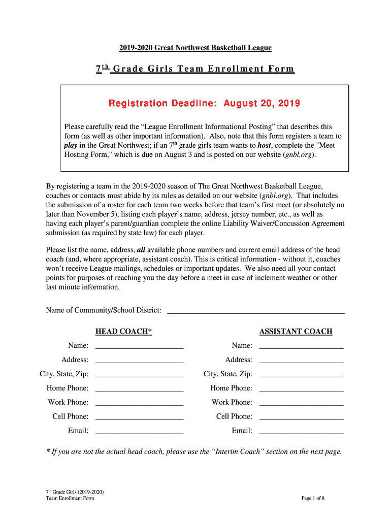 20192020 Great Northwest Basketball League7th Grade Girls Team Enrollment Preregistration Deadline: August 20, 2019, Please carefully read the League Enrollment Informational Posting that describes
