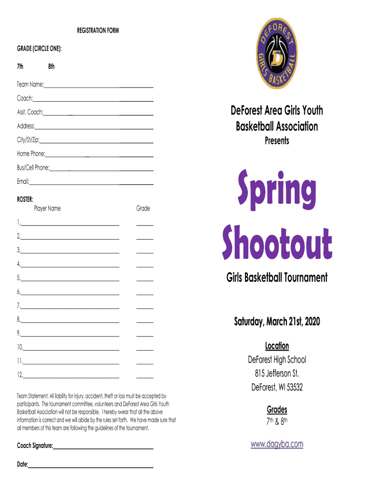 REGISTRATION FORM GRADE (CIRCLE ONE): 7th8thTeam Name: Coach: Address: Deforest Area Girls Youth Basketball Associativity/St/Zip: PresentsAsst. Coach: Home Phone: Bus/Cell Phone: Email: ROSTER: Player