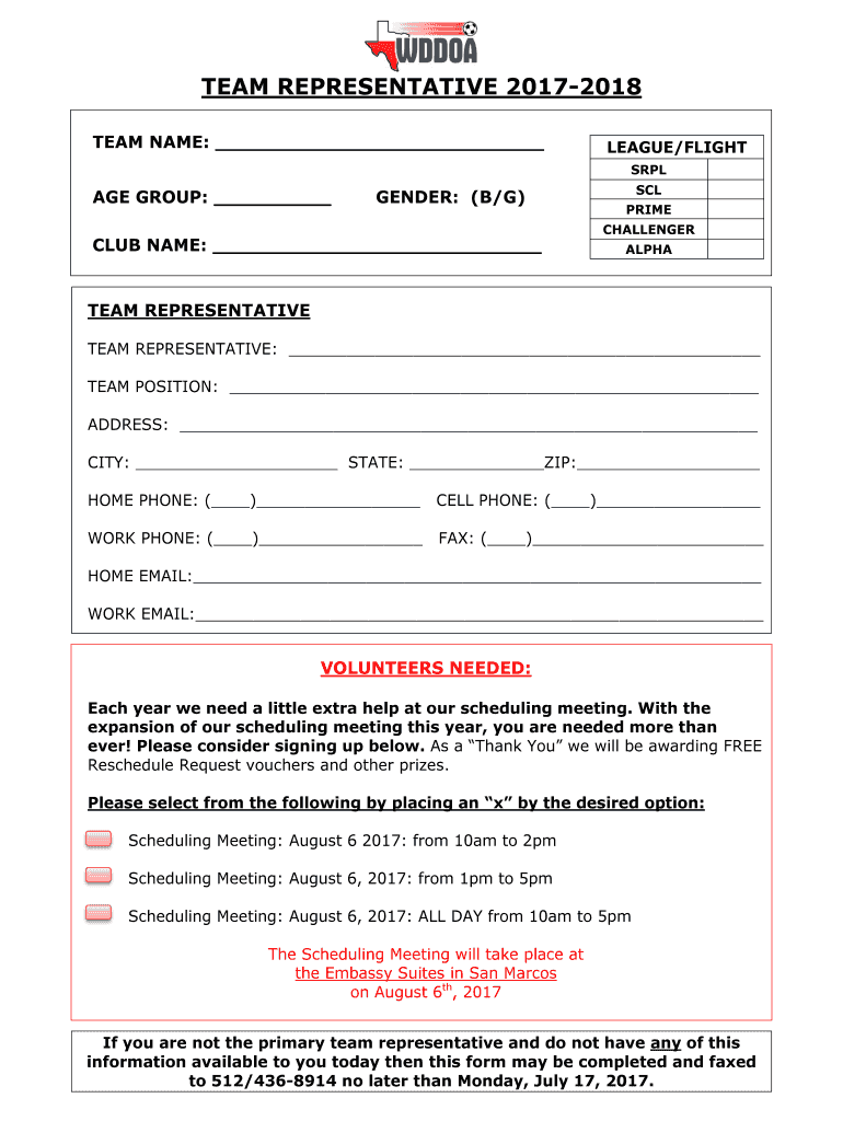 TEAM REPRESENTATIVE 20172018 TEAM NAME: LEAGUE/FLIGHT SILAGE GROUP: GENDER: (B/G)CLUB NAME: SCL PRIME CHALLENGER ALPHABET REPRESENTATIVE TEAM REPRESENTATIVE: TEAM POSITION: ADDRESS: CITY: STATE: ZIP: