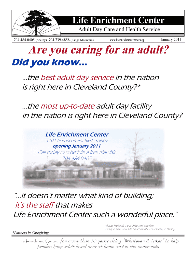 704.484.0405 (Shelby) 704.739.4858 (Kings Mountain)www.lifeenrichmentcenter.orgJanuary 2011Are you caring for an adult? Did you know......the best adult day service