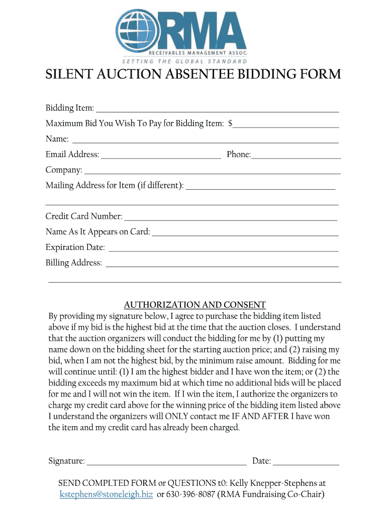 SILENT AUCTION ABSENTEE BIDDING FORM Bidding Item: Maximum Bid You Wish To Pay for Bidding Item: $ Name: Email Address: Phone: Company: Mailing Address for Item (if different): Credit Card Number: