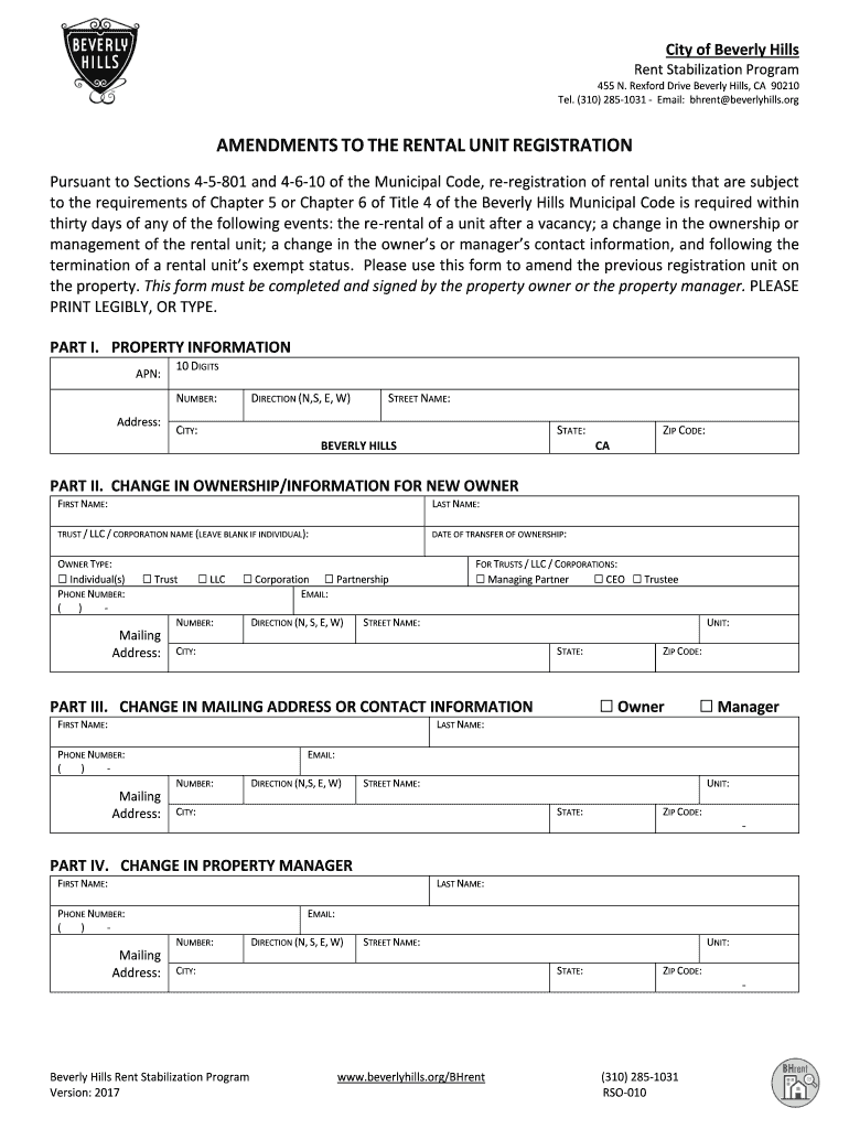 City of Beverly Hills Rent Stabilization Program 455 N. Redford Drive Beverly Hills, CA 90210 Tel. (310) 2851031 Email: Brent beverlyhills. Amendments TO THE RENTAL UNIT REGISTRATION Pursuant to Sections