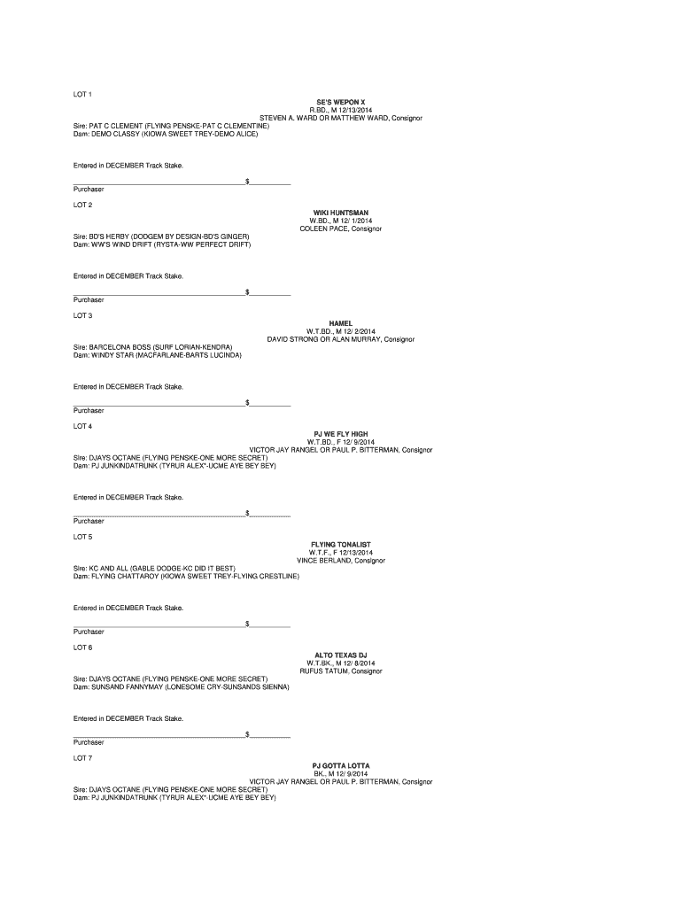 LOT 1 SE IS WEAPON X R.BD., M 12/13/2014 STEVEN A. WARD OR MATTHEW WARD, Consignor Sire: PAT C CLEMENT (FLYING PENSKEPAT C CLEMENTINE) Dam: DEMO CLASSY (KIOWA SWEET TRENDED ALICE)Entered in DECEMBER