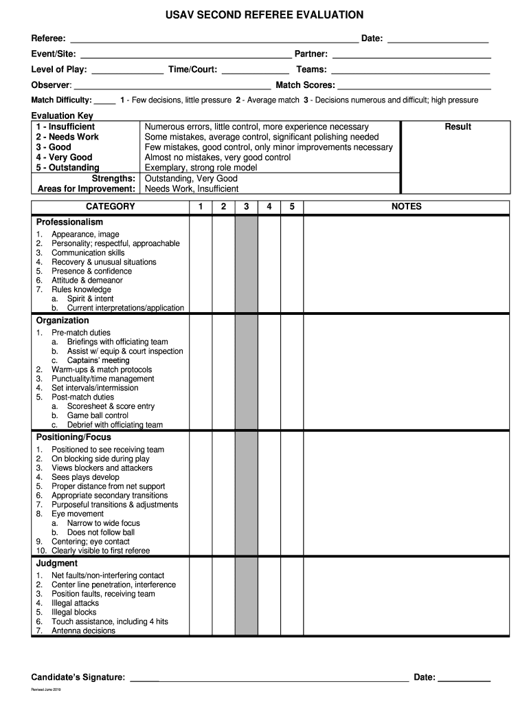 USA SECOND REFEREE EVALUATION Referee: Date: Event/Site: Partner: Level of Play: Time/Court: Teams: Observer: Match Scores: Match Difficulty: 1 Few decisions, little pressure 2 Average match 3 Decisions