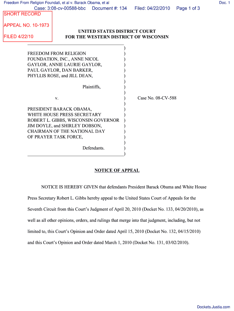 Freedom From Religion Foundation, et al. v. Barack Obama, ET case: 3:08cv00588bbc SHORT RECORDDocument #: 134Doc. 1Filed: 04/22/2010Page 1 of 3APPEAL NO. 101973 UNITED STATES DISTRICT COURT FILED