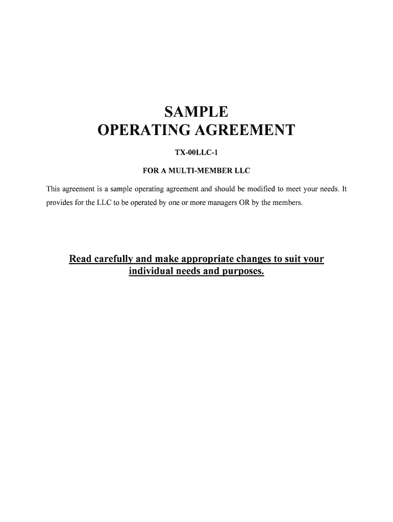 SAMPLE OPERATING AGREEMENT TX00LLC1 FOR A MULTIMEMBER LLC This agreement is a sample operating agreement and should be modified to meet your needs. It provides for the LLC to be operated by one or