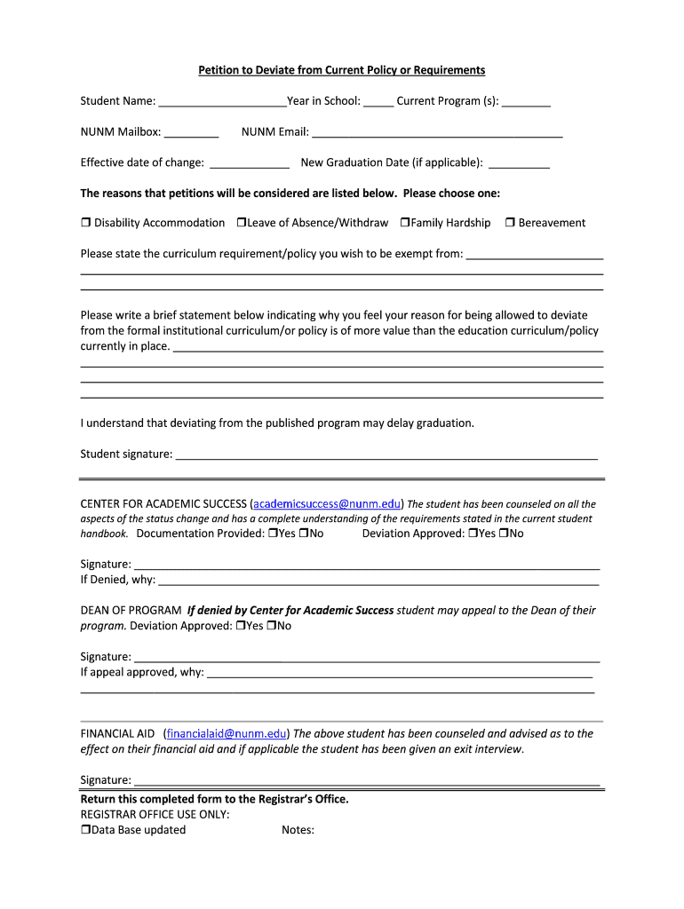 Petition to Deviate from Current Policy or Requirements Student Name: Year in School: Current Program (s): NUN Mailbox: NUN Email: Effective date of change: New Graduation Date (if applicable): The
