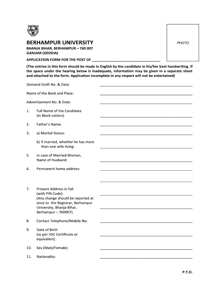 BERHAMPUR UNIVERSITYPHOTOBHANJA BIHAR, BERHAMPUR 760 007 GANJA (ODISHA) APPLICATION FORM FOR THE POST OF (The entries in this form should be made in English by the candidate in his/her best handwriting.