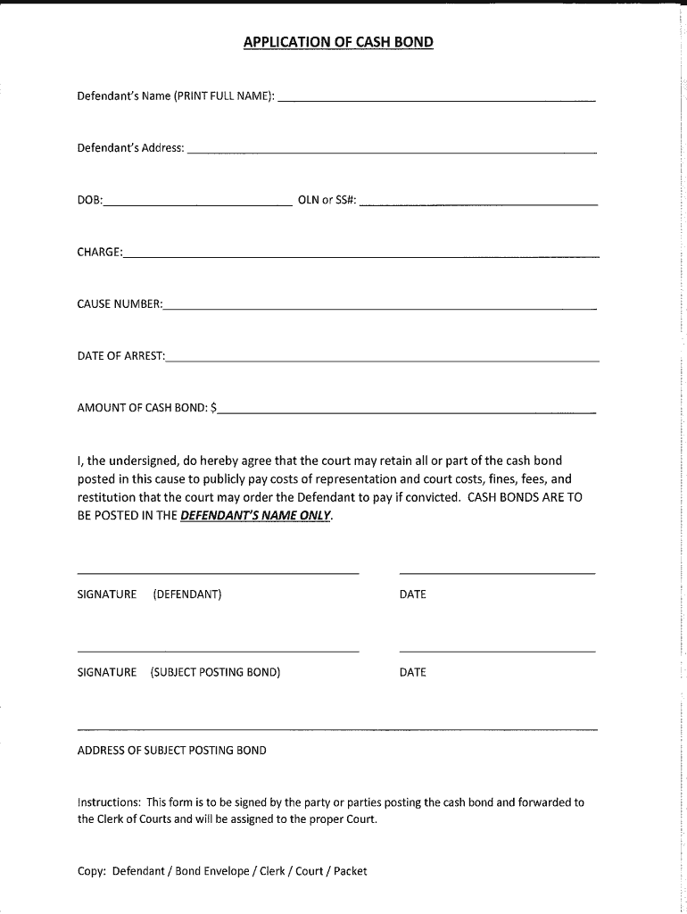 APPLICATION OF CASH BONDDefendant's Name (PRINT FULL N A M E) : Defendant's A d d r e s : DOB: ON RSS#: CHARGE: CAUSE NUMBER: DATE OF ARREST: AMOUNTOFCASHBOND:$ I, the undersigned, do hereby agree